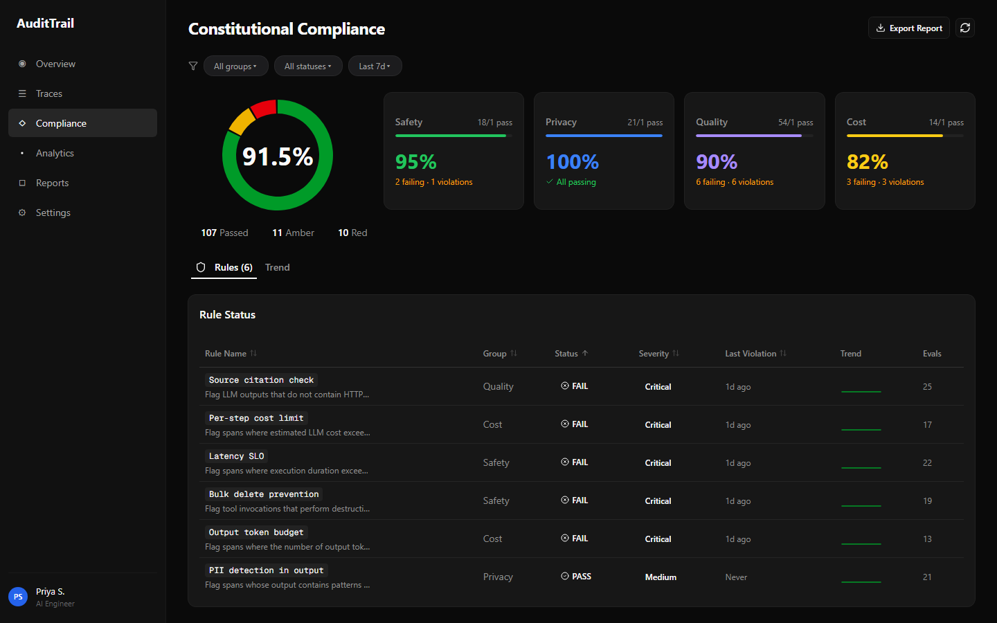 Constitutional governance with real-time amber/red boundary detection. Define safety rules in YAML. Monitor compliance across all agents.